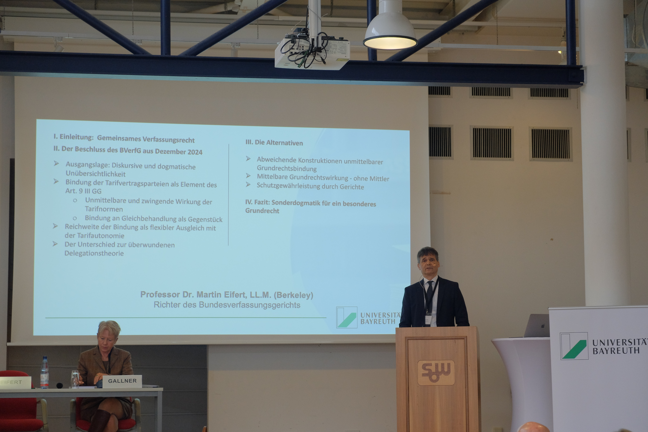 Am 24. Oktober 2025 fand an der Universität Bayreuth eine Fachtagung zur gleichheitsrechtlichen Kontrolle von Tarifverträgen statt. Organisiert wurde die Veranstaltung von der Präsidentin des Bundesarbeitsgerichts Inken Gallner und Professor Dr. Adam Sagan, MJur (Oxon), Inhaber des Lehrstuhls für Bürgerliches Recht, europäisches und deutsches Arbeitsrecht an der Universität Bayreuth. Im Mittelpunkt stand die Entscheidung des Bundesverfassungsgerichts vom 11. Dezember 2024, die erstmals eine unmittelbare Bindung der Tarifparteien an den Allgemeinen Gleichheitssatz (Art. 3 Abs. 1 GG) bejahte. Diskutiert wurden insbesondere die Reichweite der gleichheitsrechtlichen Kontrolle, die primäre Korrekturkompetenz der Tarifparteien sowie die Folgen für das Unionsrecht, das bei Diskriminierungen bislang nur eine „Anpassung nach oben“ kennt.