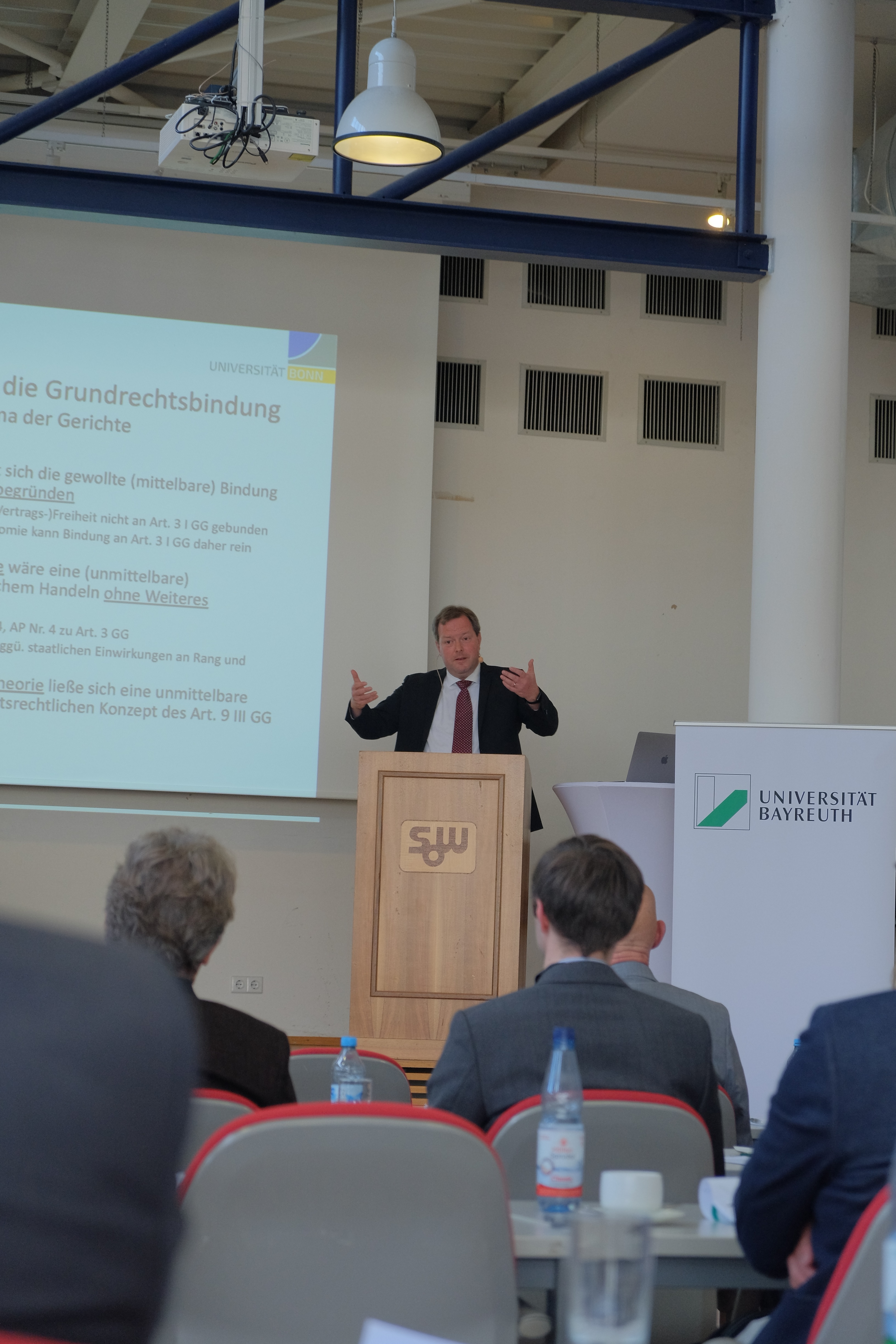 In Zusammenarbeit mit dem Deutschen Arbeitsgerichtsverband e.V. richtete der Lehrstuhl Zivilrecht II dessen erste Ortstagung in Bayreuth in den Räumlichkeiten des Landgerichts Bayreuth aus. Im Justizpalast referierte Prof. Dr. Sebastian Roloff, Richter am Bundesarbeitsgericht, über das Thema „Arbeitsschutz im Arbeitsverhältnis“ mit anschließender Diskussion und einem Get-together.