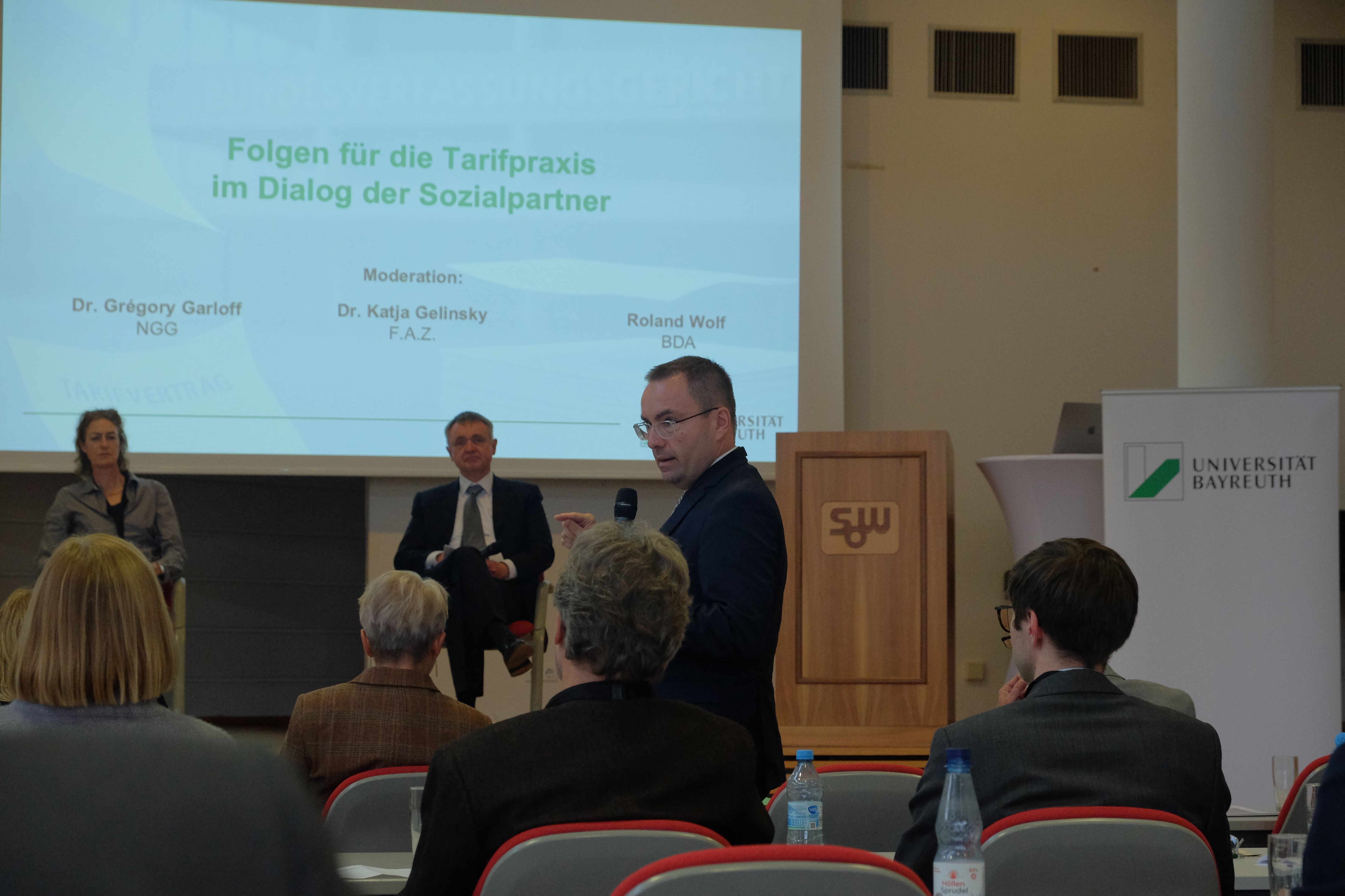 Den Auftakt machte Professor Dr. Martin Eifert, LL.M. (Berkeley), Richter des Bundesverfassungsgerichts und Berichterstatter der benannten Entscheidung. Anschließend diskutierte Professorin Dr. Dres. h.c. Monika Schlachter (Universität Trier, IAAEU) die europarechtliche Dimension der Thematik. Eine systematische Einordnung nahm Professor Dr. Stefan Greiner (Universität Bonn) vor. Professor Dr. Daniel Ulber (Universität Trier, IAAEU) beleuchtete die praktischen Probleme, die sich aus der primären Korrekturkompetenz auf der Ebene des deutschen Rechts ergeben. Die Abschlussdiskussion zwischen Roland Wolf (BDA) und Dr. Grégory Garloff (NGG) moderierte Dr. Katja Gelinsky, LL.M. (Frankfurter Allgemeine Zeitung).